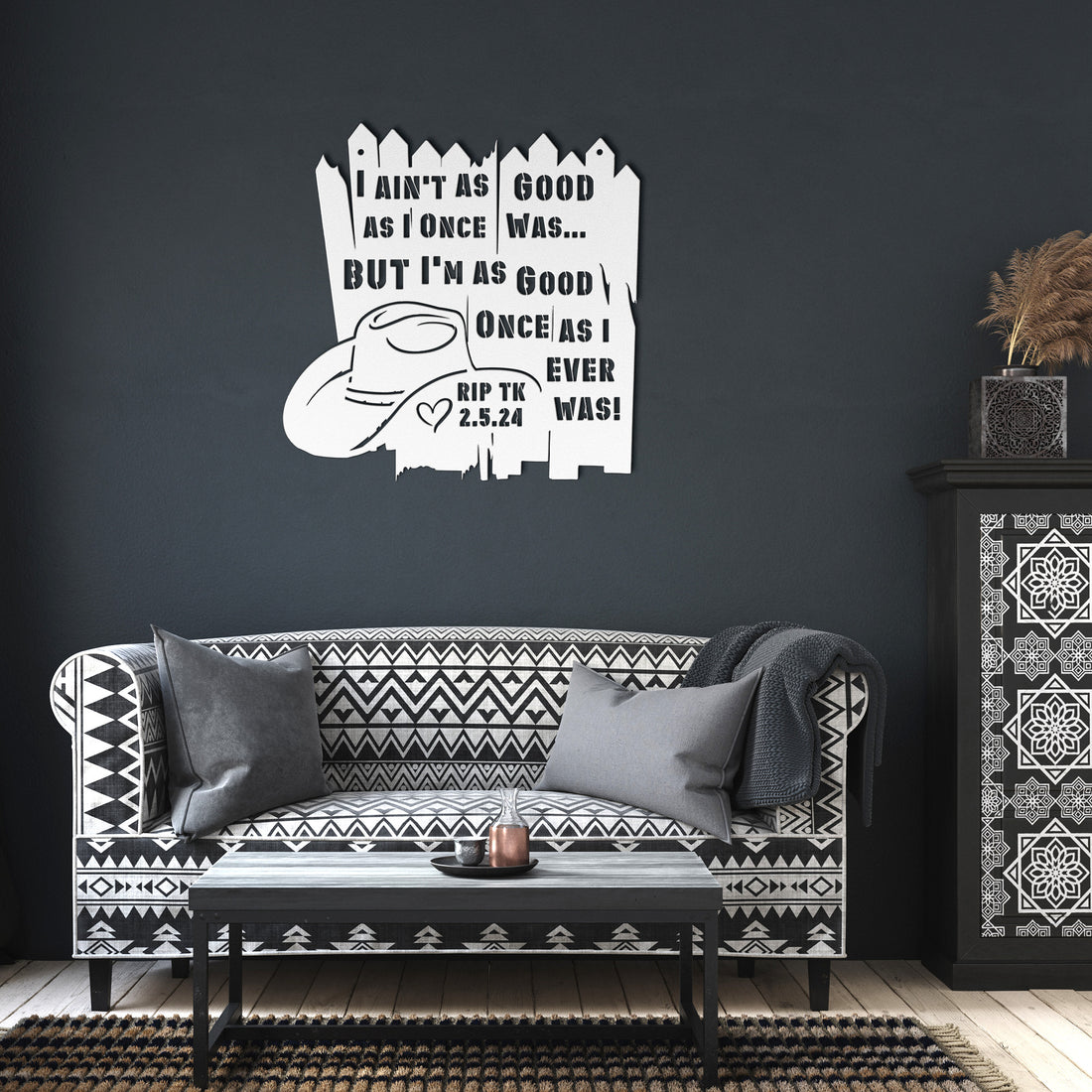 Keep Toby Close to Your Heart: RIP 7/8/1961–2/5/2024 Celebrate the legendary Toby Keith with this playful tribute metal wall art! Crafted from genuine American steel and powder-coated for durability, this custom piece honors one of music’s greatest icons. Perfect for any fan who wants a unique and lasting tribute in their home. Easy to hang with nails or screws (mounting hardware not included). Rock on with a decor piece as timeless as Toby’s tunes!